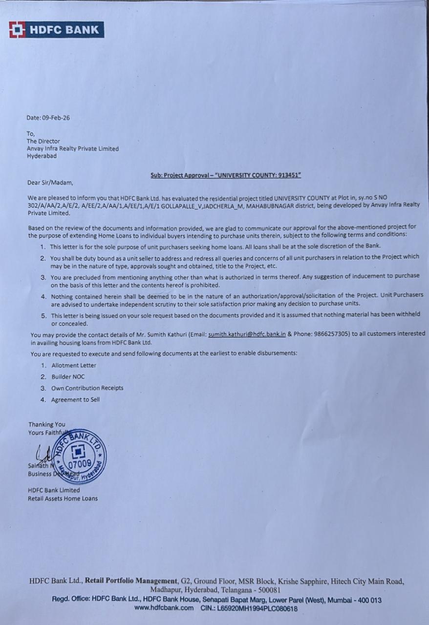 University County by Anvay Group is a premium open plots project in Jadcherla, strategically located at Gollapally on NH 44 Hyderabad–Bangalore National Highway. This residential plotted development near Hyderabad is situated in a fast-growing growth corridor, offering excellent connectivity, high visibility, and strong long-term appreciation. The project is ideal for buyers looking for approved plots near Hyderabad with future-ready infrastructure and peaceful surroundings.